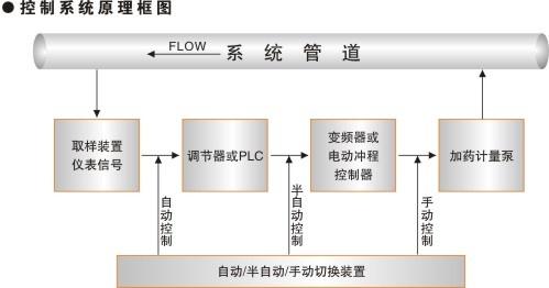 在自動(dòng)控制柜內(nèi)設(shè)有獨(dú)立的動(dòng)力電源,由所對(duì)應(yīng)的電源開關(guān)控制,采用變頻控制器和數(shù)顯PID調(diào)節(jié)器或PLC對(duì)計(jì)量泵電機(jī)進(jìn)行控制, 通過帶電氣和機(jī)械互鎖的轉(zhuǎn)換開關(guān)及中間繼電器實(shí)現(xiàn)三種工作狀態(tài):自動(dòng)、半自動(dòng)、手動(dòng)控制模式。在自動(dòng)控制模式下,數(shù)顯PID調(diào)節(jié)器或PLC接收來自取樣分析儀表變送器輸出的4-20mA信號(hào),根據(jù)用戶要求的指標(biāo)設(shè)定值經(jīng)PID運(yùn)算后輸出調(diào)節(jié)型4-20mA信號(hào)調(diào)節(jié)變頻器的頻率輸出,完成對(duì)計(jì)量泵電機(jī)轉(zhuǎn)速的閉環(huán)自動(dòng)控制。在半自動(dòng)控制模式下,計(jì)量泵的控制脫離外部儀表信號(hào)的閉環(huán)控制,操作人員可直接調(diào)節(jié)變頻器的電位計(jì)調(diào)節(jié)旋紐實(shí)現(xiàn)對(duì)計(jì)量泵電機(jī)轉(zhuǎn)速的控制。在手動(dòng)控制模式下,計(jì)量泵電機(jī)的運(yùn)行狀態(tài)脫離了變頻器輸出的控制,完全是在交流工頻三相電源直接供電的形式下運(yùn)行,對(duì)計(jì)量泵流量的調(diào)節(jié)依靠手動(dòng)調(diào)節(jié)計(jì)量泵的沖程調(diào)節(jié)手柄來實(shí)現(xiàn)。控制系統(tǒng)中采用的PID數(shù)字顯示調(diào)節(jié)器或PLC還可以實(shí)現(xiàn)對(duì)測量指標(biāo)效果的動(dòng)態(tài)監(jiān)視。