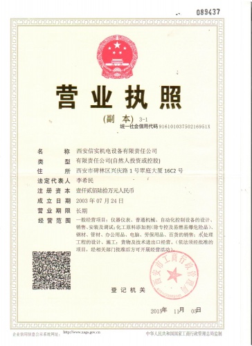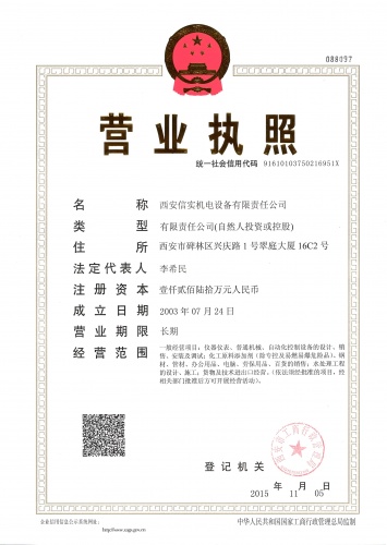 2015年11月22日,西安信實機電設備有限責任公司完成了營業執照、組織機構代碼證、稅務登記證的“三證合一”更換手續,領取了“一照一碼”新營業執照。